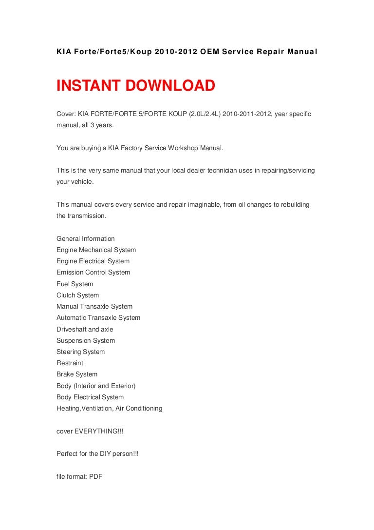This manual Kia Forte Forte5 Koup 2010 Service Manual provides you with all the necessary information step by step, what you need, you have access to pictures, the diagrams, assembly, disassembly, cleaning, repairing, maintenance of Kia Forte Forte5 Koup 2010 Service Manual .. Kia Koup Forte 2010 2011 2012 Workshop Service Repair Manual – Reviews Specs. To separate itself from the pack—not to mention sister company Hyundai—Kia says it wants to become a. The Kia Forte Koup Reliability Rating is 4.5 out of 5.0, which ranks it 15th out of 36 for compact cars. The average annual repair cost is $425 which means it has excellent ownership costs..