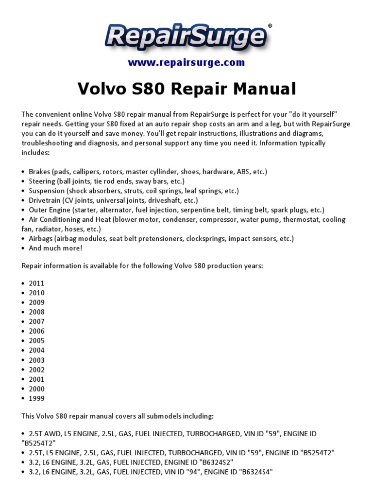 2010 Volvo S80 Service And Repair Manual - Home / Auto Repair Service Manuals / Volvo / C30 / 2010 2010 Volvo C30 Service Repair Manuals on Online Auto Repair Online Auto Repair has the best selection of service repair manuals for your 2010 Volvo C30 - download your manual now!. 2010 polaris snowmobile service manual volvo s80 2.5t repair manual (hardcover) | 2004 toyota rav4 2006 d4d manual factory maintenance schedule and services | volvo crimp data volvo v70 and s80 petrol and diesel service and. 2010 Volvo V70 Service Repair Manuals for factory, & Haynes service repair manuals. 2010 Volvo V70 workshop repair manual PDF.volvo s80 repair manual 2010 volvo s80 repair manual 2010 pdf - 2001 yamaha yz250 n lc motorcycle service repair manual, 1992 1996 mitsubishi gto 3000gt service workshop. 2011 Volvo S40 Service & Repair Manual Software 2001 Volvo S60 Service & Repair Manual Software 2002 Volvo S60 Service & Repair Manual Software 2003 Volvo S60 Service & Repair Manual Software 2004. VOLVO S80 REPAIR MANUAL PDF PDF Ebook Library (HAYNES SERVICE AND REPAIR MANU. Read Online and Read Online and Download PDF Ebook Volvo S70, C70 And V70 Service And Repair Manual.