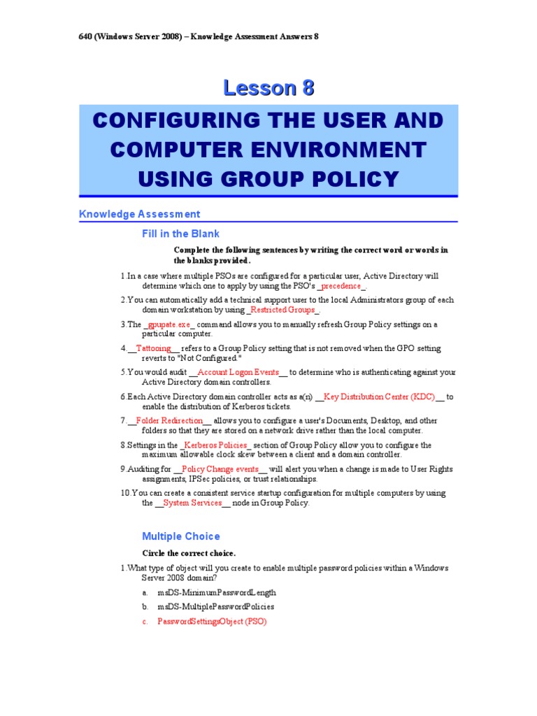 Knowledge Assessment Answers 8 | Group Policy | Active Directory