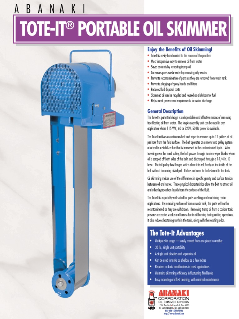 Abanaki's Oil Viper Tube Skimmer is the ideal solution for separating oil from water at the lowest possible cost.. Video ansehen · The Abanaki TubeTastic! oil skimmer can be used on machining centers with little or no access to the coolant sump from above. This unit can skim oil from. Baldwin is the exclusive supplier of Abanaki Belt and Tube Oil Skimmers. Contact us for more information on our range of oily water separators..