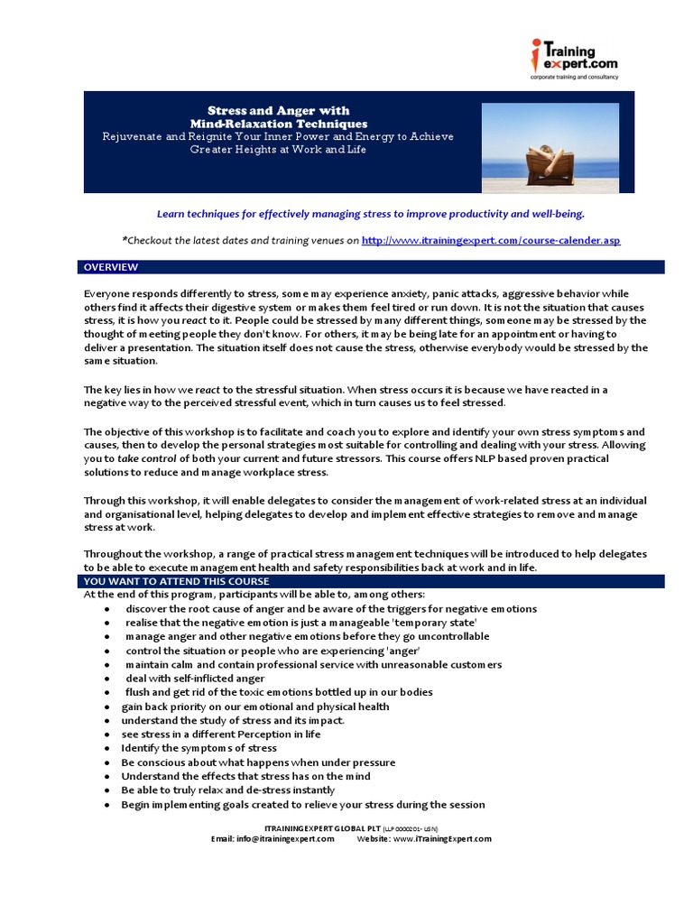 Anger Control Training Practical Training Manuals - TRAINING MANUAL ON ENTREPRENEURSHIP AND MANAGEMENT OF SMALL BUSINESS FOR WOMEN This training manual was prepared under the “Training on Entrepreneurship and Management of Small Business for Women in The Gambia, Senegal and Sierra Leone” (2016-GMBPOVER-206) funded by the COMCEC. We recognize the feeling of anger, without even realizing we are angry, and react in a habitual, but unhealthy way without stopping to think about what it was that made us angry, or why.Part of anger management and taking an anger management course is to learn to stop that habit of reaction.. Training Goal: To teach youth -control of anger Moral Reasoning Training Goal: To raise youth’s level of fairness, justice, and concern with the Transfer training (encourage practice outside of program) Use reducers (i.e. deep breathing) (self-statements like “stay calm”) Identify cues.Anger Control Training (affective/emotional component). This component is intended to help youths recognize their external and internal triggers for aggression, aggression signals, and how to control anger using various techniques. Participating youths must bring to each session one or more descriptions of recent anger-arousing experiences. Anger Management - Don't let your anger scare people! We help you break down and improve patterns of communication so you can become more Assertive to meet your needs. Change Management Training Conflict Management Training Line Management Training Management Skills Training Performance Management Training Project Management Training Senior. Anger Management Essentials (AME) is a three-day live certification training for those who are interested in providing anger management services. Anger management classes can be offered by anyone who goes through the three-day training by a National Anger Management Association (NAMA) approved trainer..