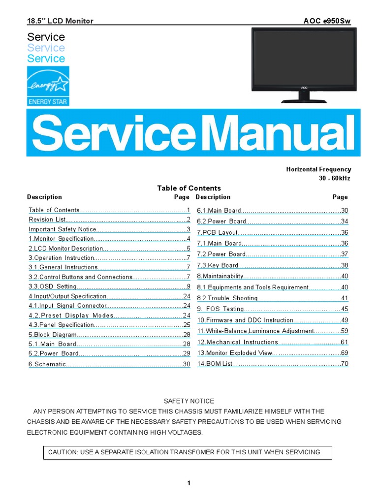 Aoc Lcd Monitor Service Manual - AOC 919sz Service Manual Add to Favourites . 19 AOC 931Swl 720p Widescreen LCD Monitor (Black) This 19- inc h 16 :9 widesc ree n mo nito r fea tures a vie wab le ima ge size o f 18.5-inc h a nd a 1366 x 768 reso lutio n. Fast ac tio n vid eos are c rysta l c lear not b lurry tha nks to the fast 5 ms respo nse time.. Proper service and repair is important to the safe, reliable operation of all AOC Company Equipment. The service procedures recommended by AOC and described in this service manual. 20" LCD Monitor AOC e2050Sa 1 Service Service Service Horizontal Frequency 30 - 83kHz The service procedures recommended by AOC and described in this serv ice manual are effective met hods of performing service operations. Some of these service operations require the use of tools specially designed for the purpose. Hereafter throughout.20" LCD Monitor AOC e2050Sda 1 Horizontal Frequency procedures recommended by AOC and described in this service manual are effective methods of performing service operations. Some of these service operations require the use of tools specially designed for the purpose. 2.LCD Monitor Description The LCD monitor will contain a main board. All service manuals are OEM / Factory, and available ONLY as a download and in Acrobat .pdf format, and are in English unless otherwise specified. IMMEDIATE DOWNLOAD OF PURCHASED SERVICE MANUAL UPON COMPLETION OF PAYMENT. Proper service and repair is important to the safe, reliable operation of all AOC Company Equipment. The service procedures recommended by AOC and described in this serv ice manual are effective met hods of performing service operations. Some of these service operations require the use of tools specially designed for the purpose. The.