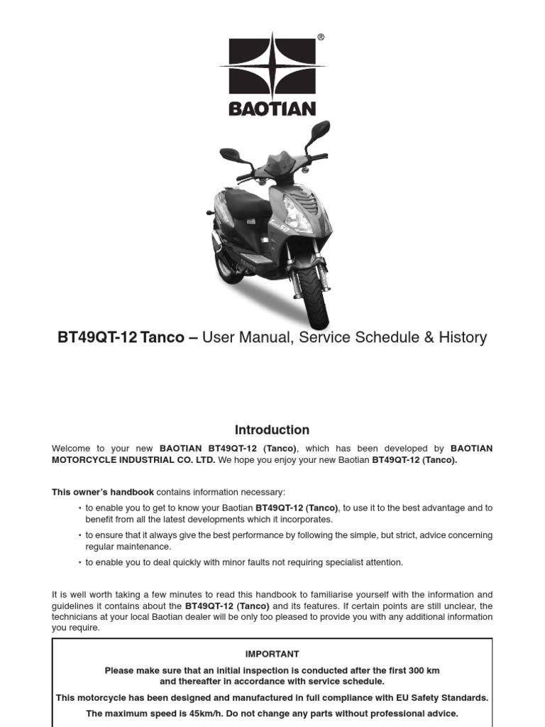 Baotian Bt49qt 9 Repair Manual - Page 1. BT49QT-11 User’s Manual Page 2. Preface Thank you very much for purchasing ‘BAOTIAN’ brand motorcycle of model BT50QT-11E, which developed by BAOTIAN. Page 1 BAOTIAN SVERIGE AB Page 2 This manual gives you information about the general structure, function, operation and maintenance methods of BT49QT-7.. Search for parts by Manufacturer - We stock many parts for Honda, Suzuki, Yamaha as well as Baotian, Lexmoto, Lifan, Sukida, Sinnis and many other Japanese, European and Chinese models.Größter Motorrad-Gebrauchtteile-Händler in OWL. Ständig mehr als 1.500 japanische Oldtimer und Youngtimer Basis-Fahrzeuge und Umbauteile für Streetfighter-, Scrambler-, Bobber- und. Willkommen bei BASTEL-BIKES.DE. Wir verkaufen Bastel-Motorräder aus dem Bestand von motorradteile-bielefeld.de - mit Angebotsschwerpunkt bei japanischen Young- und.