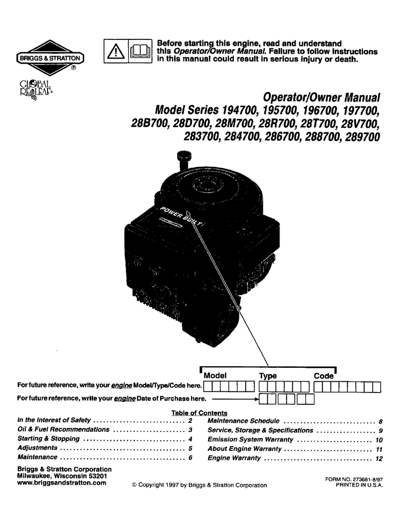 Is there an adjustment screw on the carburettor? Or is it a more serious issue. - Briggs and Stratton 675 Series Repair. Skip to main content. Fix Your Stuff. Right to Repair. Parts & Tools. Back Answers Index; 585681. Briggs and Stratton 675 Series. Briggs & Stratton 190cc Model 120000 Quantum 675 Series Lawn Mower Engine. Free Manuals. Briggs and Stratton Service Manuals for Mechanics Briggs and Stretton Manuals for Mechanics Simply the Best Compilation of Briggs and Stratton Manuals Created Over 50 Workshop Service and Repair Manuals on this Self Running Data DVD. Simply Pop in your drive and Go! Self starting Menue system click the Book you require. Simple to us menue system..