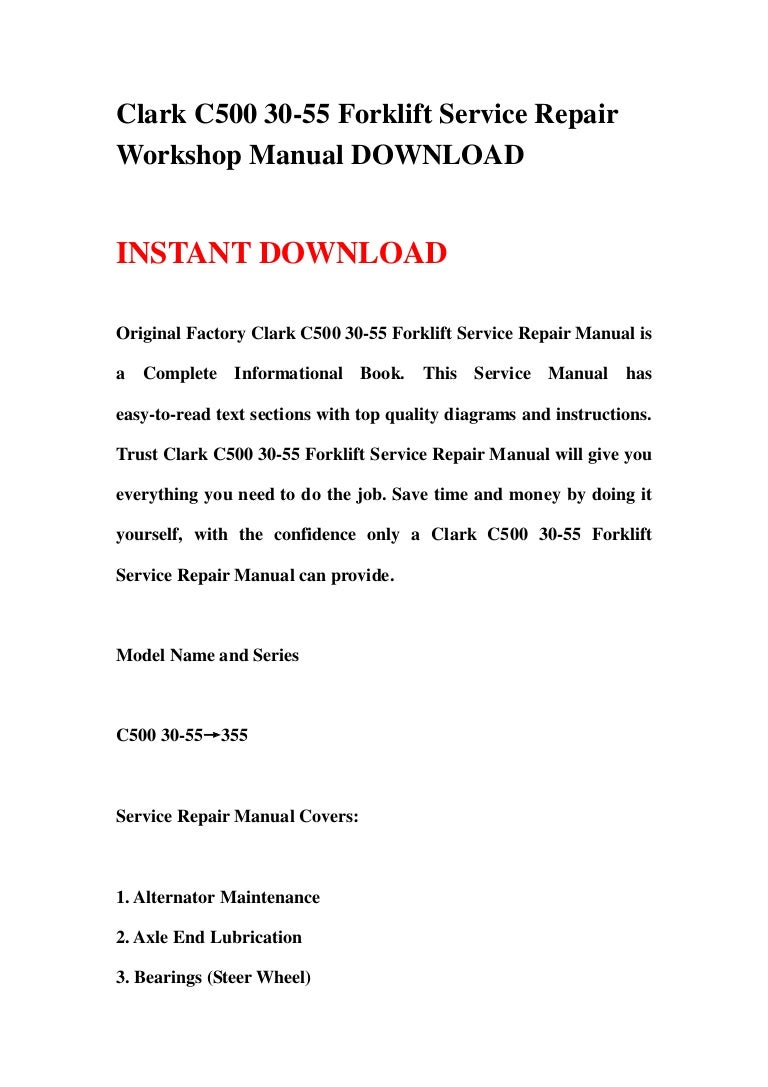 C500 30 Service Manual Pdf - book-] compaq presario c500 service manual.pdf ebookcompaq presario c700 service manual pdf - techsocial.co.zahp compaq - eserviceinfo.comcompaq presario v5000 service manual guide [pdf]download compaq c500 service manualservice manual compaq c500 pdf - s3.amazonaws.comcompaq c500.pdf - free. Clark C500(Y) 30-55 Forklift Service Repair Workshop Manual DOWNLOAD. INSTANT DOWNLOAD Original Factory Clark C500(Y) 30-55 Forklift Service Repair Manual is a Complete Informational Book.. This PDF service manual will show you every nut and bolt on your vehicle. With hundreds of pages, it will show you how to distinguish any problem (from an oil.clark forklift service manual c500 f25 Fri, 08 Feb 2019 00:34:00 GMT clark forklift service manual c500 pdf - Clark C500 Forklift Series (OH-339) Here is our PDF. Clark C500 30 Service Manual If searched for a ebook Clark c500 30 service manual in pdf form, in that case you come on to faithful site. We presented the full variant of this ebook in ePub, DjVu, doc, txt, PDF. Clark C500(Y) 30-55 Forklift Service Repair Workshop Manual DOWNLOAD. INSTANT DOWNLOAD Original Factory Clark C500(Y) 30-55 Forklift Service Repair Manual is a Complete Informational Book..