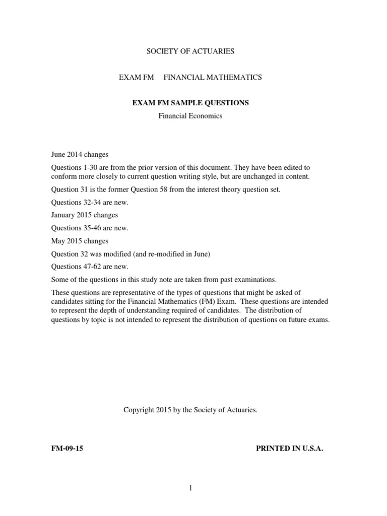 Welcome to the Exam FM home page! Please review all of the information and links provided below. Exam FM is a three–hour multiple–choice examination and is offered via computer-based testing (CBT). Enhanced Computer Based Scheduling: STEP 1: Register with the Society of Actuaries by the exam. Shop the ACTEX Exam FM Study Manual. View a sample of the ACTEX Exam FM Study Manual. SOA Exam FM Home Page and Syllabus. The manual has been extensively revised and updated to reflect changes in the SOA syllabus for Exam FM that will be effective with the June 2017 administration of the exam. The new syllabus has eliminated most of the. 1/24 Chapter 1. Basic Interest Theory. Manual for SOA Exam FM/CAS Exam 2. Chapter 1. Basic Interest Theory. Section 1.5. Nominal rates of interest and discount..