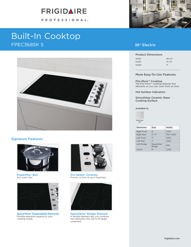 Frigidaire Fpec3685ks Ranges Owners Manual - Check out this Frigidaire Professional 36'' Electric Cooktop and other appliances at Frigidaire.ca. MAIN MENU. Search. Home Owner Center Product Support & Manuals FPEC3685KS. Frigidaire Professional 36'' Electric Cooktop. 36-1/2" W x 21-1/2" D x 5" H fpec3685ks.. Frigidaire FPEC3685KS Specification Sheet Related Manuals for Frigidaire FPEC3685KS. Cooktop Frigidaire FPEC3685KS - 36" Electric Cooktop Wiring Diagram. (all languages) (1 page) Ventilation Hood Frigidaire PLHV42P8KC Owner's Manual. Frigidaire range hood owner's guide plhv42p8kc (24 pages) Ventilation Hood Frigidaire FHWC3060LS Use And. View and Download Frigidaire Range use and care manual online. Slide-in models. Range Ranges pdf manual download..Appliance manuals and free pdf instructions. Find the user manual you need for your home appliance products and more at ManualsOnline. Free Frigidaire Stove User Manuals | ManualsOnline.com. Manuals and free owners instruction pdf guides. Find the user manual and the help you need for the products you own at ManualsOnline. Free Frigidaire User Manuals | ManualsOnline.com. manuals.frigidaire.com.