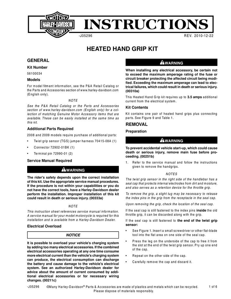 Heated Hand Grip Kit Instruction Sheet - Harley | manualzz.com