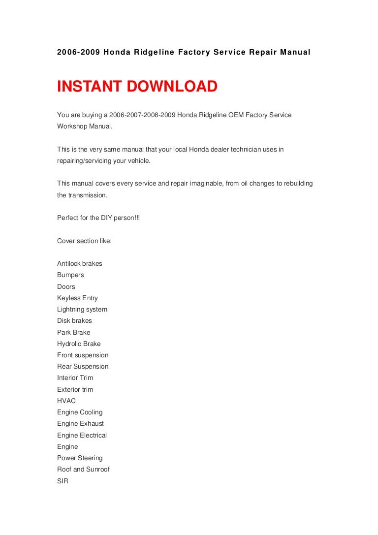 Honda Ridgeline Owner Manual Download - Honda Ridgeline Dvd Player User Manuals Owner's manual 2017 honda ridgeline honda owners site, you have no vehicle information saved in your honda owners. Download Honda Ridgeline Truck Service Manual Honda 2010 ridgeline truck owners manual (427 pages) Automobile Honda 2011 Ridgeline Owner's Manual.. HONDA RIDGELINE 2013 1.G Owner's Manuals and Service Manuals for online browsing and download. CarManualsOnline.info is the largest free online database of HONDA Owner's Manuals and HONDA Service Manuals..Download: Honda 2012 Ridgeline Repair Service Manual User Guides[READ] Honda 2012 Ridgeline Repair Service Manual User Guides [FREE] only available if you are registered here. And you also can download or read online all Book PDF file that related to Honda 2012 Ridgeline Repair Service Manual User Guides book. Happy reading Honda 2012 Ridgeline Repair Service Manual User Guides Book. honda-ridgeline-owners-manual-pdf.pdf - 6/22/2016 · reference guide, navigation manuals and service manual in pdf 2017 Honda Ridgeline. Honda Ridgeline Owners Manual Pdf Click Here >>> Read/Download. HONDA RIDGELINE 2010 1.G Owner's Manuals and Service Manuals for online browsing and download. CarManualsOnline.info is the largest free online database of HONDA Owner's Manuals and HONDA Service Manuals..