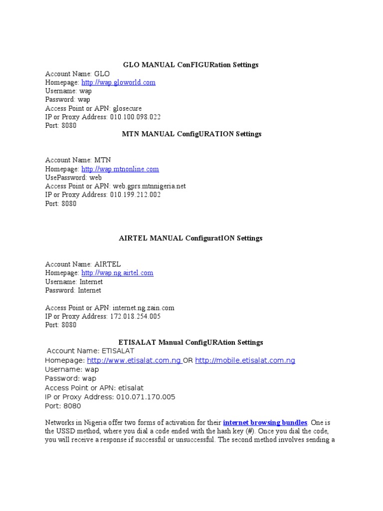 MTN, GLO, ETISALAT and AIRTEL Manual configuration Settings. – Asuktek MTN, GLO, ETISALAT and AIRTEL Manual configuration Settings.