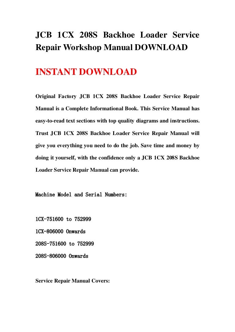 Jcb 1 cx 208s backhoe loader service repair workshop manual download