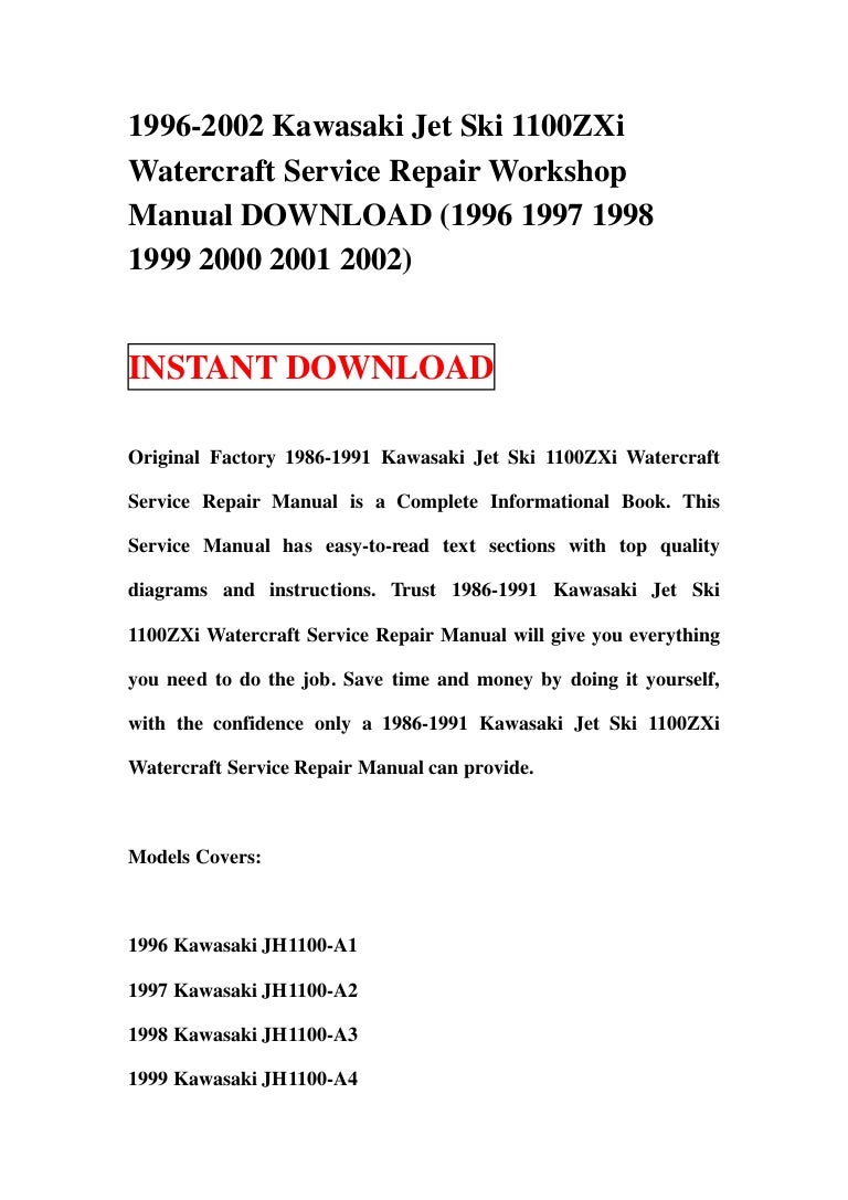 Kawasaki 1100 Zxi 1997 Factory Service Work Shop Manual Download - Kawasaki Jet Ski Service Manuals, get the information you need to fix and repair your 650 750 800 900 1100 1200 1500 PWC Jetski now..