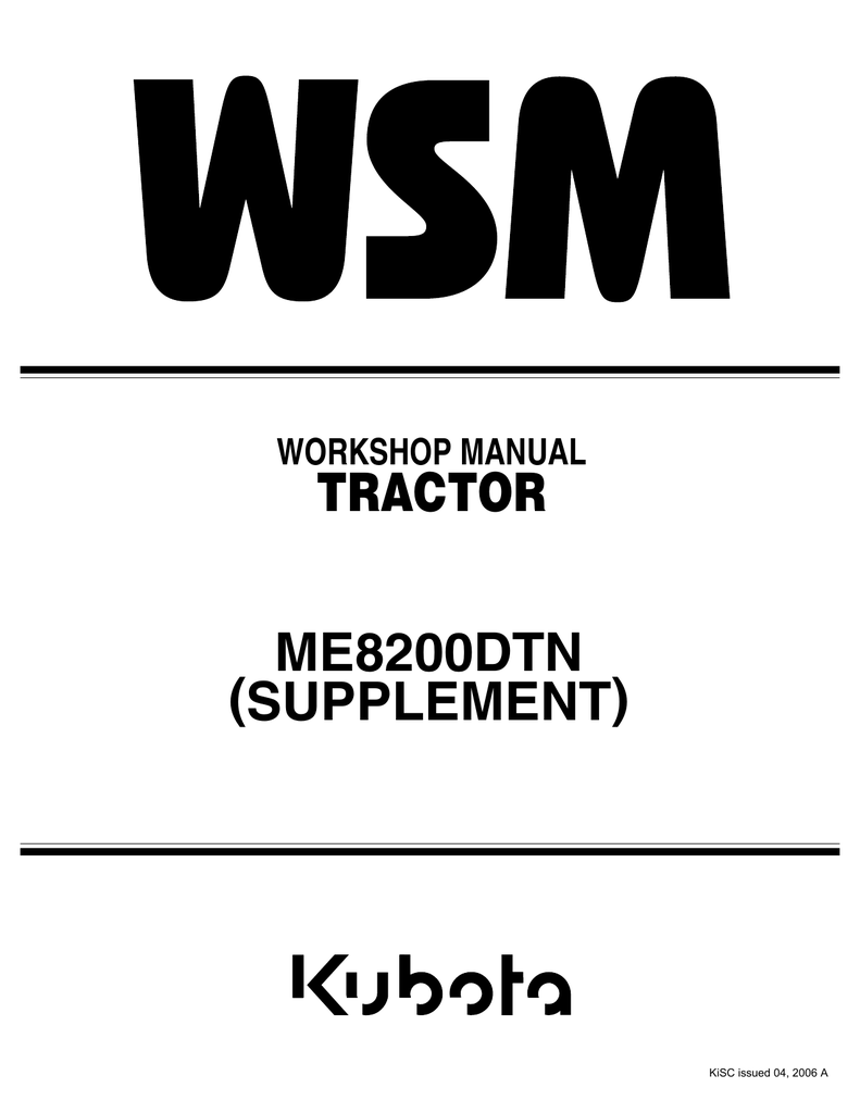 Kubota Tractor Me8200dtn Supplement Service Manual - Kubota ME8200DTN Tractor Service Manual Fix your problems now with this service manual. Get the statistics you need to restoration your TRACTOR ME8200DTN SUPPLEMENT in only seconds in this simple to download digital PDF book. No special software program required (works on all computers).. KUBOTA M9000DT-M tractor from M6800 M6800S M8200 M9000 supplement WSRM - 9.99 USD 3. KUBOTA TRACTOR ME8200DTN supplement Service Manual - 9.99 USD ===== PRODUCT DETAILS: 1. Kubota M6800 M8200 M9000 Tractor Service Manual This is the COMPLETE official full factory service repair manual for the Kubota M6800 M8200 M9000 Tractor. This KUBOTA. Kubota Tractor Manuals Below are many of the manuals that we offer for Kubota tractors. If you see something you like, place a quantity in the box next to the manual that interests you and fill out the payment and shipping information at the end of this page..Sep 28, 2008 · Kubota Service Manual Kubota’s official name for its service/repair manuals are Workshop Manuals or WSMs. These are the manuals one would use, in conjunction with a parts manual, to perform more serious repairs. They are in printed format, typically provided in a orange plastic Kubota 3-ring binder and are usually not less than 200+ pages in. Page 1 WORKSHOP MANUAL TRACTOR M9000DT-M ( SUPPLEMENT ) KiSC issued 04, 2006 A; Page 2 Use this workshop manual together with workshop manual for M6800, M6800S, M8200 and M9000. In this section, the main additional function and altered position of M9000DT-M tractor from M6800, M6800S, M8200, M9000 tractor are explained separately in two items, “Mechanism” and “Servicing” for. We offer Kubota tractor manuals and a variety of other items and parts for the Kubota tractors. Kubota B1700, B2100, & B2400 Tractor Service Manual: $132.88 $112.95 (SAVE 15%)! Kubota B2320 B2620 B2920 Service Manual, 408 pgs: B2150 Supplement Parts Manual: $27.00 $22.95 (SAVE 15%)! Kubota B2150 Operators Manual, 50 pages Special Order.