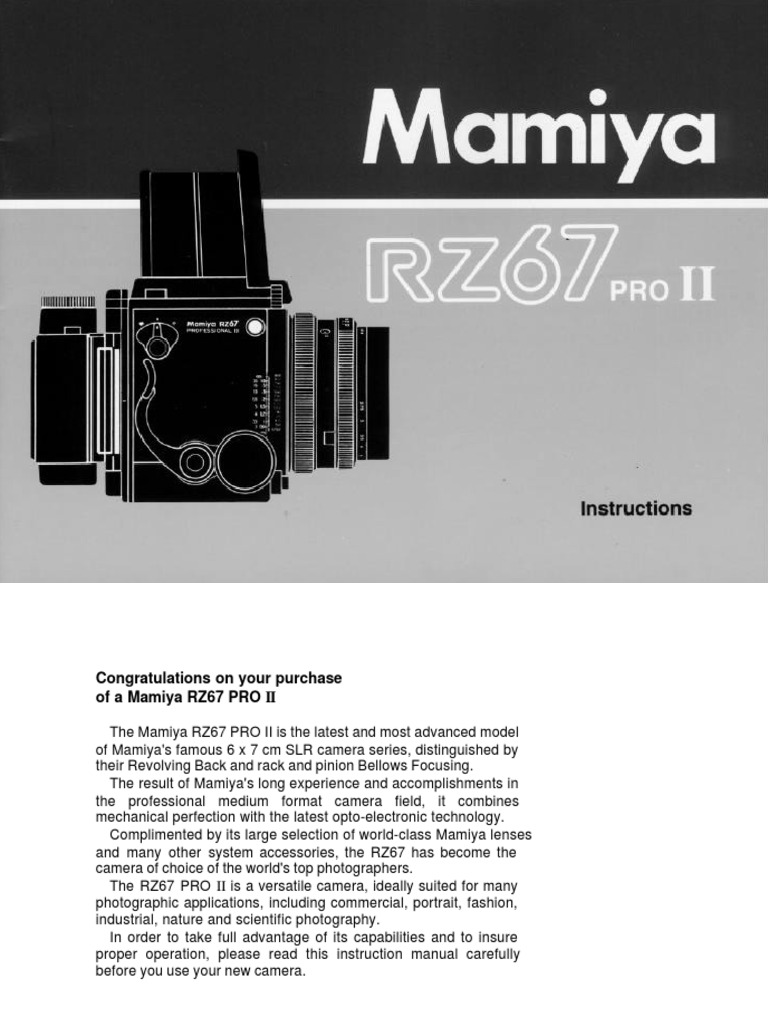 User Manual For Mamiya 7 II. These files are related to User manual for Mamiya 7 II. Just preview or download the desired file.. 27.09.2006 · Ok, I forget about something.If somebody here have the Complete Repair Manual for Mamiya RZ67 Pro, I have another Complete Repair and User's Manuals for another cameras to exchange with. Hmmm, for Canon Eos 1V, from Nikon F until Nikon F5, Nikon FA, N90s.. Mamiya RZ67 Pro II Camera with Waist Level, 50mm F/4.5w and 150mm F/3.5w Lenses, non AE Prism Finder, 120 Film Back(2).