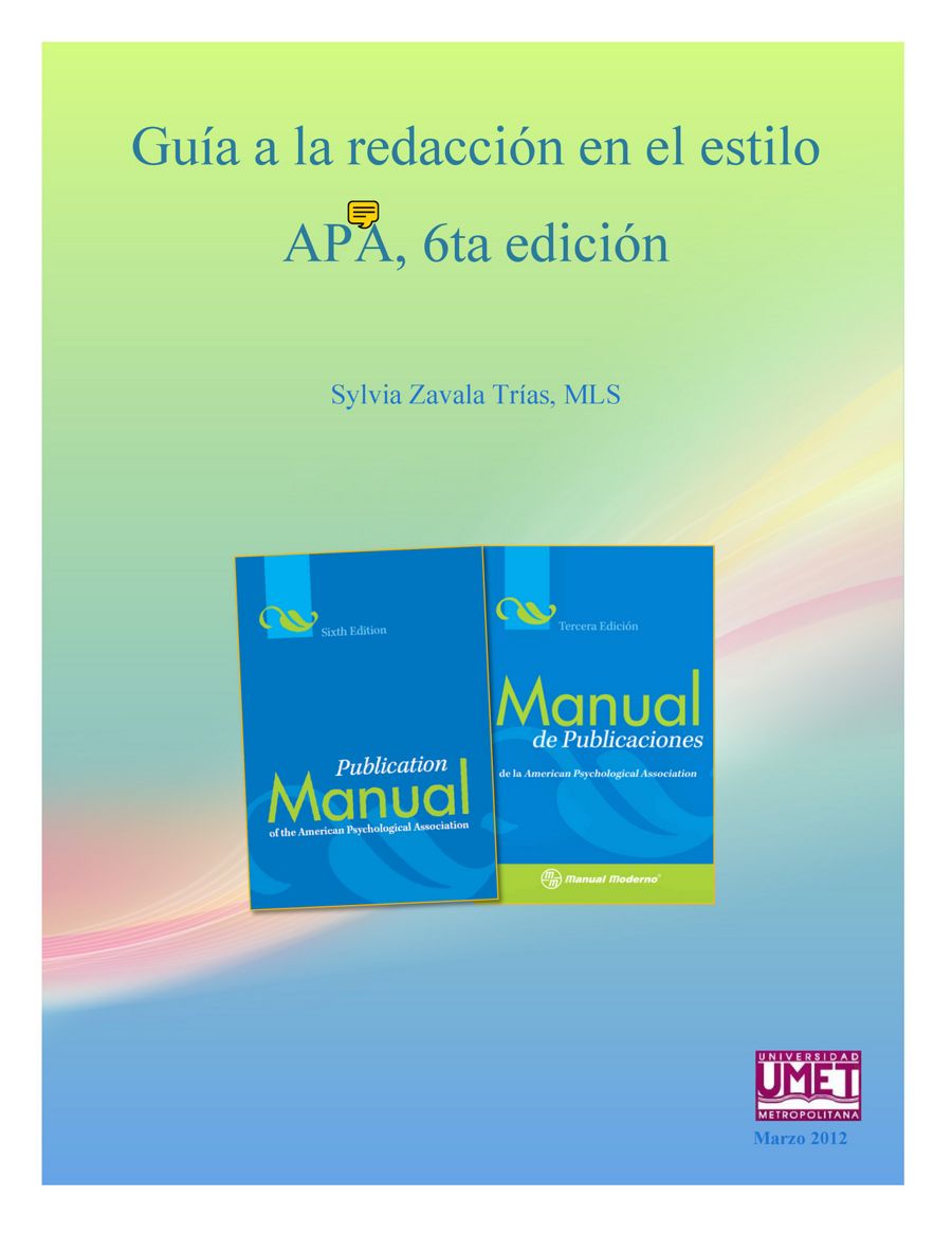 Manual De Estilo Apa 2012 - A Complete Resource for Writing and Publishing in the Social and Behavioral Sciences. The rules of APA Style ®, detailed in the Publication Manual of the American Psychological Association, offer sound guidance for writing with simplicity, power, and concision.. El estilo/formato APA es el estándar elaborado por la Asociación Estadounidense de Psicología (American Psychological Association, APA), en 1929 para la elaboración y presentación de trabajos escritos de ciencias de la conducta o de ciencias sociales.. 1 Introducción al estilo APA para citas y referencias (lineamientos de la 3ª edición). Mtra. Ana Cuevas Romo Dr. Sergio Méndez Valencia Revisado por: Dr. Roberto Hernández Sampieri.Manual APA: regras gerais de estilo e formatação de trabalhos acadêmicos Organizado por: Andreia de Almeida Elba dos Santos Souza Lopes Jeam Tiago da Silva Camilo. INTRODUCCIÓN El propósito de esta guía es proveer los aspectos básicos del Manual de publicaciones de la American Psychological Association (APA) que requerirá al redactar un trabajo. BibMe Free Bibliography & Citation Maker - MLA, APA, Chicago, Harvard.