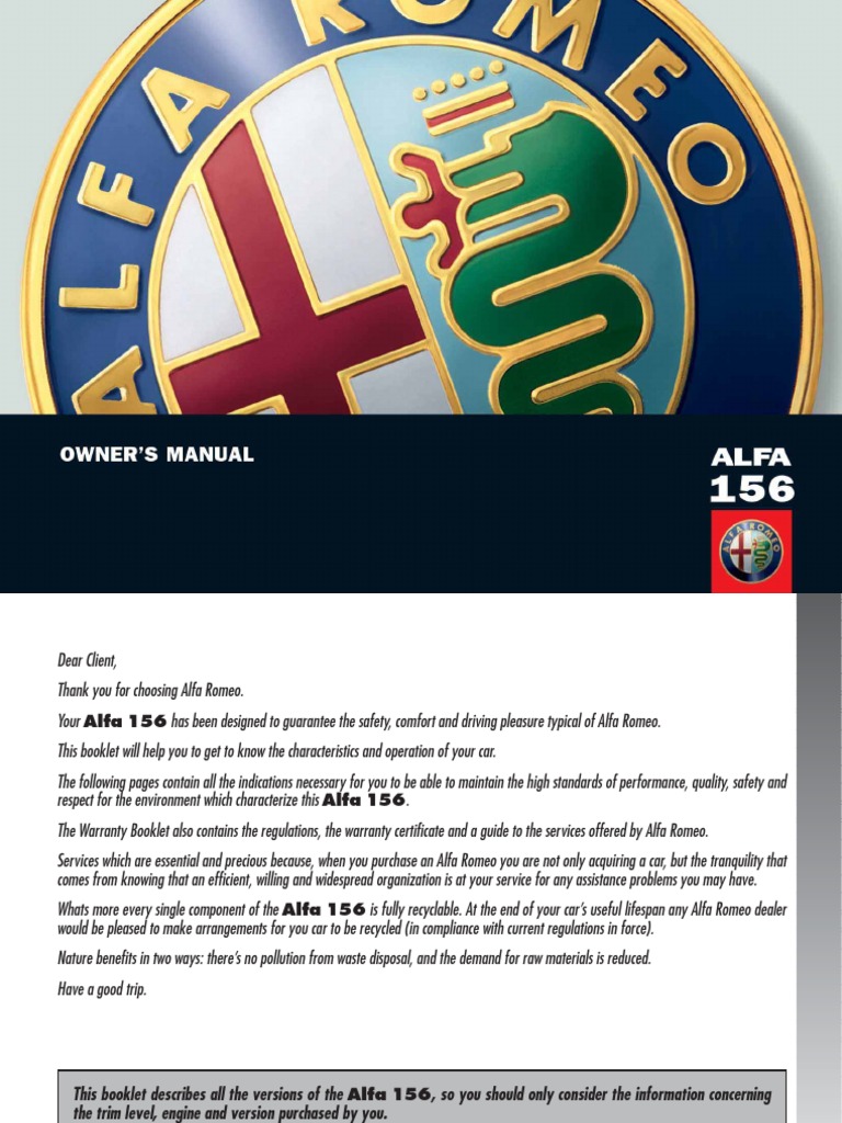 Manuals Alfa Romeo 156 Espaol - Alfa 156 Owners Manual PDF. This webpage contains Alfa 156 Owners Manual PDF used by Alfa Romeo garages, auto repair shops, Alfa Romeo dealerships and home mechanics. With this Alfa Romeo Alfa 156 Workshop manual, you can perform every job that could be done by Alfa Romeo garages and mechanics from: changing spark plugs, brake fluids, oil changes,. Estimado Cliente, Le felicitamos y le agradecemos que haya elegido un Alfa Romeo. Hemos preparado este manual para permitirle apreciar plenamente las cualidades de este coche. Le recomendamos leer atentamente todos sus captulos antes de ponerse por primera vez al volante.. -manual taller Alfa Romeo 156 JTD-manual taller Lancia Delta Prisma 4wd-manual taller Lancia Delta Integrale/Evoluzione * manual taller Fiat Bravo-Brava * manual taller Fiat Nuovo Panda * manual taller Fiat Stilo * manual taller-usuario Alfa Romeo 164-manual taller Renault Safrane-manual taller Renault Espace IV, fase 1.* manual taller alfa romeo 156 iso (multilingual) * manual taller alfa romeo 159 iso (multilingual) * manual taller alfa romeo 147 restyling iso (multilingual) * manual taller alfa romeo brera iso (multilingual) * manual taller alfa romeo 164 pdf (ingles) * foros PLUS (se ingresa por invitación de acuerdo a las colaboraciones).. Manual Alfa Romeo 156. Cargado por. Mileidys Rivero. Manual Alfa 156. Cargado por. Alfredo Soares. Manual Alfa. Cargado por. Adri Adrizo. DDC SVC OTH S040 Diagnostico de Embrage. Cargado por. Arturo Zavala Urquides. Cargador Frontal KomatsuWA600. Cargado por. Yossie Alferez. Informe de Transmisiones.. Jan 12, 2017 · I've just bought an Alfa 156 2.0 Selespeed but didn't get an owners manual with it either, I really could do with downloading one if you can post a link to it please as I need to identify a couple of warning lights on the dash that seem to keep coming on. Thanks..