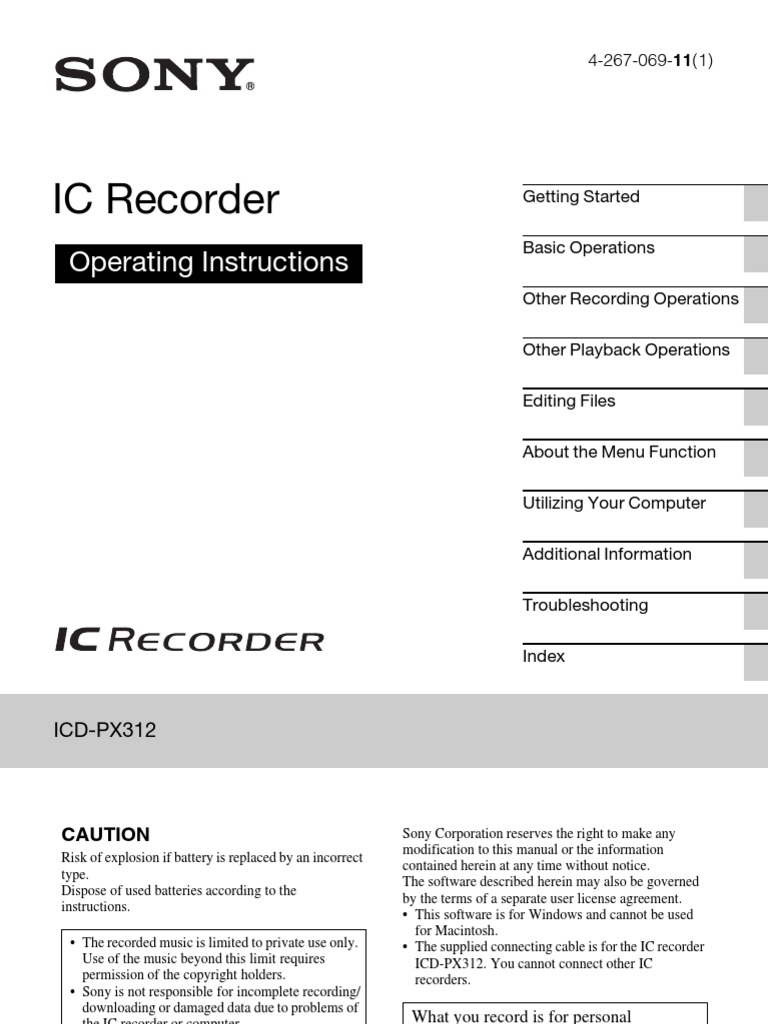 Manuals Sony Ic Recorder Icd Px312 - View and Download Sony ICD-PX312 operating instructions manual online. Sony - Digital Voice Recorder. ICD-PX312 Voice Recorder pdf manual download. Also for: Icd-px312d.. View and Download Sony ICD-PX312 quick start manual online. MP3 Recording/192kbps high quality, 2GB, 300mW speaker output, memory card slot. ICD-PX312 Voice Recorder pdf manual download. Also for: Icd-px312f.. Phone and Tablet Apps The best of what Sony has to offer on iOS or Android. Download our apps..