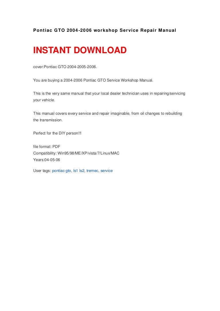 Dec 20, 2014 · Pontiac GTO 2004 2005 2006 Service Repair Manual that guide the reader through each service and repair procedure. Complete download comes in pdf format which can work under all PC based. Download Pontiac Grand Prix Service Repair Manual Download . Pontiac Grand Prix Service Repair Manual Pdf 1997 1998 1999 2000 2001 2002 2003 2004 2005 2006 2007 2008. pontiac gto 2004 2006 workshop manual.rar 1 PDF file. Repair manuals 451 MB: English 6 405 Montana: 1997 - 2005 pontiac montana 1997 2005 workshop manual haynes.pdf Repair manuals 337 MB: English 261 Solstice: 2009 pontiac solstice 2009 workshop manual.pdf Repair manuals 92.6 MB: English.