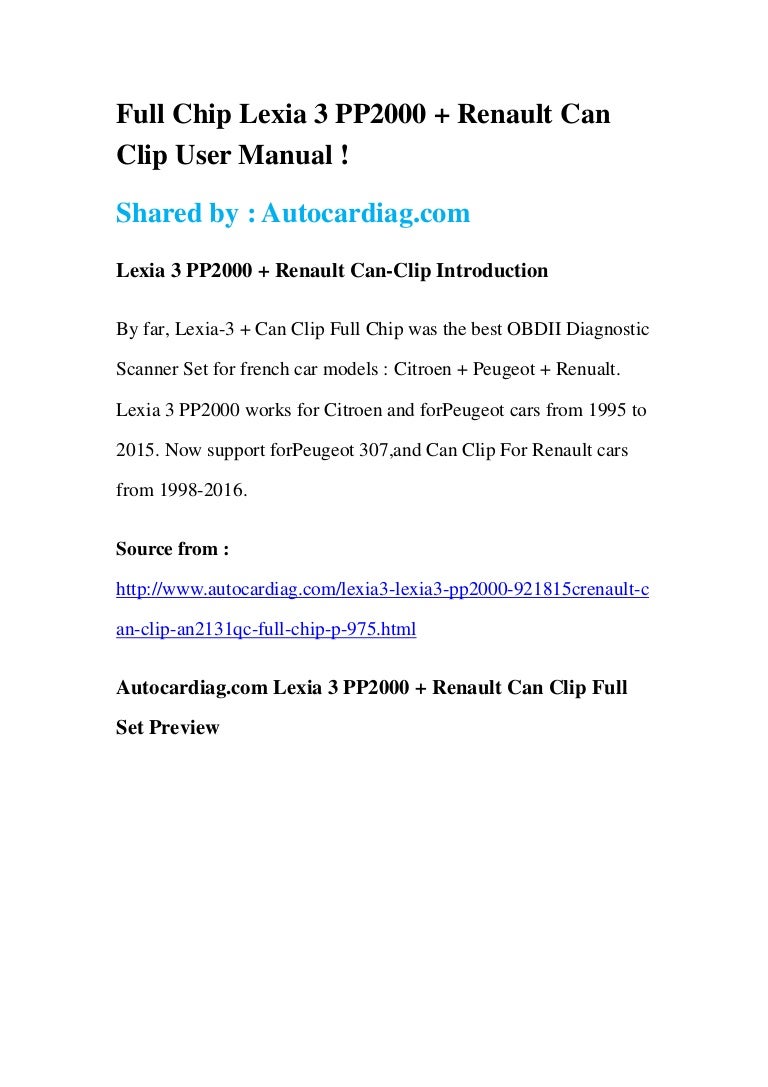 Renault Can Clip User Manual - RENAULT CLIP MANUAL Obtain free start references at the start publication library for the programs Renault Clip Manual Download PDF. Look here for bestsellers, beloved classics, and more including new top-rated title Renault Clip Manual. RENAULT CLIP MANUAL Page 1/3. Aug 17, 2017 · How to setup Renault CAN CLIP software on Macbook BMW INPA 5.0.2 vs. INPA 5.0.6; How to connect wiTECH software to VCI Pod clone; VAS 6154 china clone vs VAS 6154A Origin; BMW INPA EDIABASUser Manual July 2017 (14) June 2017 (10) May 2017 (15) April 2017 (4). Oct 12, 2019 · RENAULT CAN/K-LINE TOOL: ADVANCED SCOOTER WORKSHOP: Renault ECU Tool V2.91 (updated 10/12/2019) Added Espace IV Ph2-Ph4 (2005+) instrument cluster by OBD-II CAN-BUS; How to connect MCU programmer to Clio IV HFM D70F3633. Clio IV PAS/DAE wiring diagram. Espace III instrument cluster by CAN. User manual (EN) Espace III instrument cluster by CAN. User manual (FR).Renault CAN Clip is designed to diagnose Renault cars models including automatically test all Renault models' computers, reporgramming, airbag test and other functions. Best Quality CAN Clip V183 for Renault Diagnostic Interface with AN2135SC AN2136SC Full Chip - US$158.00. RENAULT CARDS: general information (1/2) 1 Unlocking the doors and tailgate. 2 Locking all doors and tailgate. 3 Switching on the lighting remotely. 4 Unlocking/locking the tailgate 5 Integrated key. Special note The RENAULT “SERVICE” card, for vehicles equipped with it, can be iden-tified by the word “SERVICE” engraved on the card.. May 15, 2012 · User Review and Vote. This book renault clio wiring diagram download is really easy to understand - by Alexander, May 15, 2012 5 / 5 stars Reading this book is easy and simple. The renault clio wiring diagram download very good for beginner. If you are an.