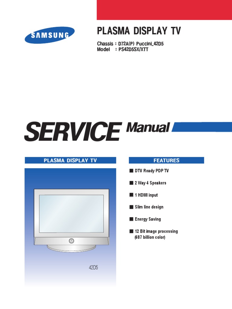 Samsung Ps42s5 Plasma Tv Service Manuals Download - Samsung TV service manual and schematic diagrams circuit. To download Samsung TV service manuals, you should select a model of your device. You can see the list of models for Samsung TV. Samsung Plasma HP-S4253 TV Owners Manual. Can I get a Hardcopy / Printed Version of the manual? Our printing service is the best on the web in Product Quality & Speed of shipping! We offer manuals that are comb bound, the pages are printed on both sides, and card stock protects the front and back of the manual that you as a product owner. SAMSUNG Service Manuals. The quickest method for finding the service manual you need for your model is to use the Search Box above. Use alphanumeric characters only – use a space for non alphanumeric characters..Samsung TV service manual and schematic diagrams circuit. To download Samsung TV service manuals, you should select a model of your device. You can see the list of models for Samsung TV. TV and television manuals and free pdf instructions. Find the user manual you need for your TV and more at ManualsOnline. Free Samsung TV and Video User Manuals | ManualsOnline.com. Jul 21, 2007 · Riddled TV Repair Forum Service Menu and Manual Schematics FAQ Search Samsung TV Service Menu Codes - PLASMA / LCD / CRT / RPTV: NOTICE: MUST READ BEFORE USING SERVICE CODES!!! RiddledTV.com provides this information for those that are qualified and trained to do TV repair work. Entering or making changes in service mode by untrained.