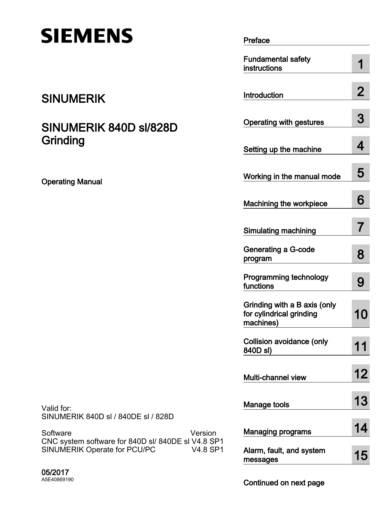 CNC Manual / Siemens SINUMERIK / SINUMERIK 828D. SINUMERIK 828D Manuals Instruction Manual and User Guide for SINUMERIK 828D. We have 25 SINUMERIK 828D manuals for free PDF download. Advertisement. Sinumerik 828 Functions and Terms Glossary. Sinumerik 828D PP 72/48D 2/2A PN IO Module Manual.. SINUMERIK User Manual Collection 09/2013 System Title SW Edition Order number Filename de en fr it es cs ct ko pt ja pl ru sv cz hu da fi nl ro sk sl tr th Languages SINUMERIK 810D SINUMERIK 840D sl/840Di sl/840D/840Di/810D Programming Manual Fundamentals 1.4/7.4 11/2006 6FC5398-1BP10-2xA0 PG X X X X X X X. SINUMERIK SINUMERIK 840D sl/840Di sl/828D/802D sl ISO Milling G code table B Data Description C Data lists D Interrupts E SINUMERIK SINUMERIK 840D sl/840Di sl/ 828D/802D sl ISO Milling Programming Manual 06/09 6FC5398-7BP10-1BA0 Valid for Software Version SINUMERIK 802D sl 1.4 If Siemens functions are to be used, one must first switch.