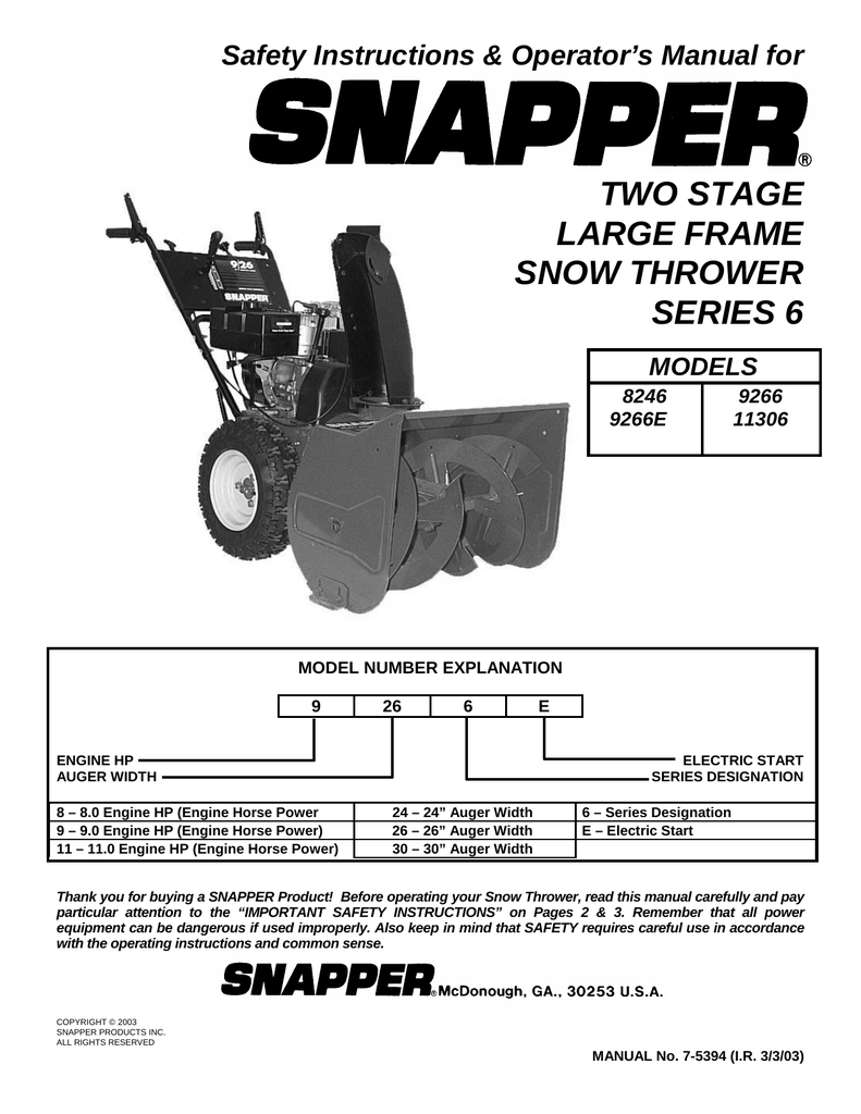 Snapper LE3170R, LE3190R, LE3190E : Single Stage Small Frame Snow ... Snapper LE3170R, LE3190R, LE3190E : Single Stage Small Frame Snow Thrower Operator's Manual