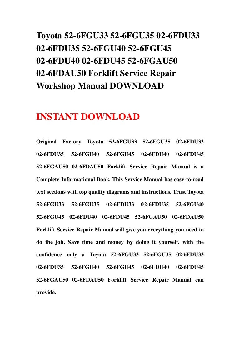 Toyota 52-6FGCU33 52-6FGCU35 52-6FGCU45 Forklift Service Repair ... Toyota 52-6FGCU33 52-6FGCU35 52-6FGCU45 Forklift Service Repair Workshop Manual.pdf by David Zhang - issuu