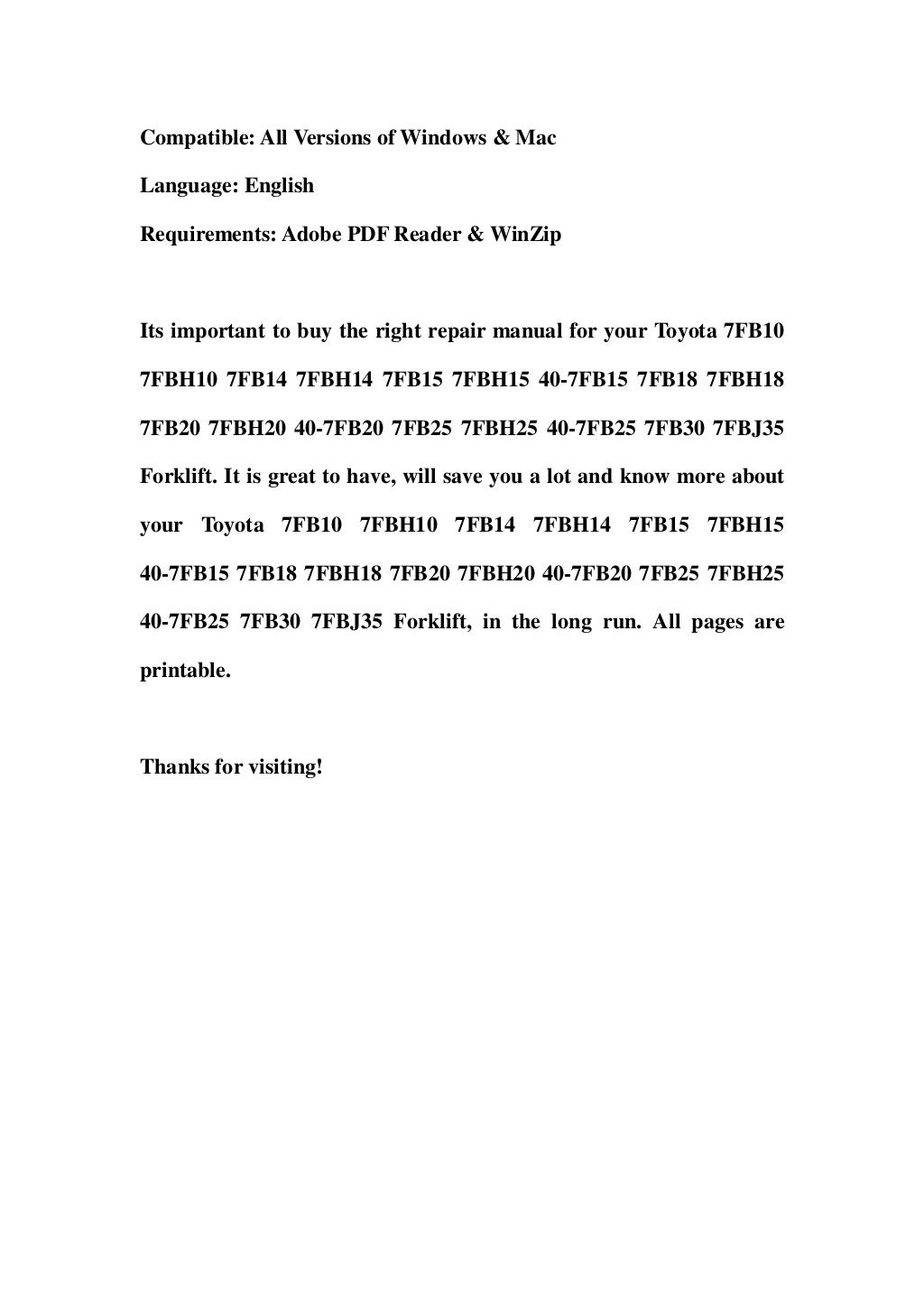 Toyota 7fb15 Forklift Factory Service Work Shop Manual Download - Instant Download: Toyota 7FB10 7FBH10 7FB14 7FBH14 7FB15 7FBH15 40-7FB15 7FB18 7FBH18 7FB20 7FBH20 40-7FB20 7FB25 7FBH25 40-7FB25 7FB30 7FBJ35 Forklift Service Repair Workshop Manual DOWNLOAD - service and repair. Toyota 6HBW23 Forklift Repair Manual. Toyota 8FBCU Forklift Service Repair Factory Manual is a digital variation of the best initial maintenance manual. Compared with the digital version and. Toyota (BT) Electric Forklift Truck: FBESF10, FBESF12, FBESF15 Workshop Service Manual.. PORTLETBRIDGE.ORG PDF Ebook and Manual Reference Toyota 8fgu30 Forklift Factory Service Work Shop Manual Printable_2020 Great ebook you must read is Toyota 8fgu30 Forklift Factory Service Work Shop Manual Printable_2020. I am sure you will like the Toyota 8fgu30 Forklift Factory Service Work Shop Manual Printable_2020. You can.ALASKAMOVING.INFO Ebook and Manual Reference Toyota 8fbcu20 Forklift Factory Service Work Shop Manual Download Printable 2019 Popular ebook you must read is Toyota 8fbcu20 Forklift Factory Service Work Shop Manual Download Printable. This Factory Service Repair Manual offers all the service and repair information for Komatsu 140E-7 Series Engine. With this in-depth & highly detailed manual you will be able to work on your vehicle with the absolute best resources available, which will not only save you money in repair bills but will also help you to look after your bussiness.. Toyota Forklift is a directory that contains detailed information about maintenance, detailed documentation on repair, repair manual, service manuals, technical specifications, electrical diagrams and circuits, maintenance information for the Toyota Industrial Equipment, presented Toyota Forklift Trucks (Engine), Forklift Trucks (Electric Reach), Forklift Trucks (Electric), Shovel Loaders.