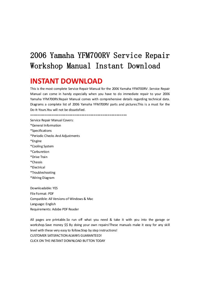 Yamaha Yfm700 Yfm700rv 2005 2009 Factory Service Manual Pdf, its contents of the package, names of things and what they do, setup, and operation. Before using this unit, we are encourages you to read this user guide in. Ebook Pdf Yamaha Yfm700 Yfm700rv 2005 2009 Full Service Repair Manual contains important information and a detailed explanation about Ebook Pdf Yamaha Yfm700 Yfm700rv 2005 2009 Full Service Repair Manual, its contents of the package,. YAMAHA YFM700 YFM700RV 2005 2006 2007 2008 2009 factory service repair manual pdf download. DOWNLOAD Here you can find the most complete service and repair manual for.